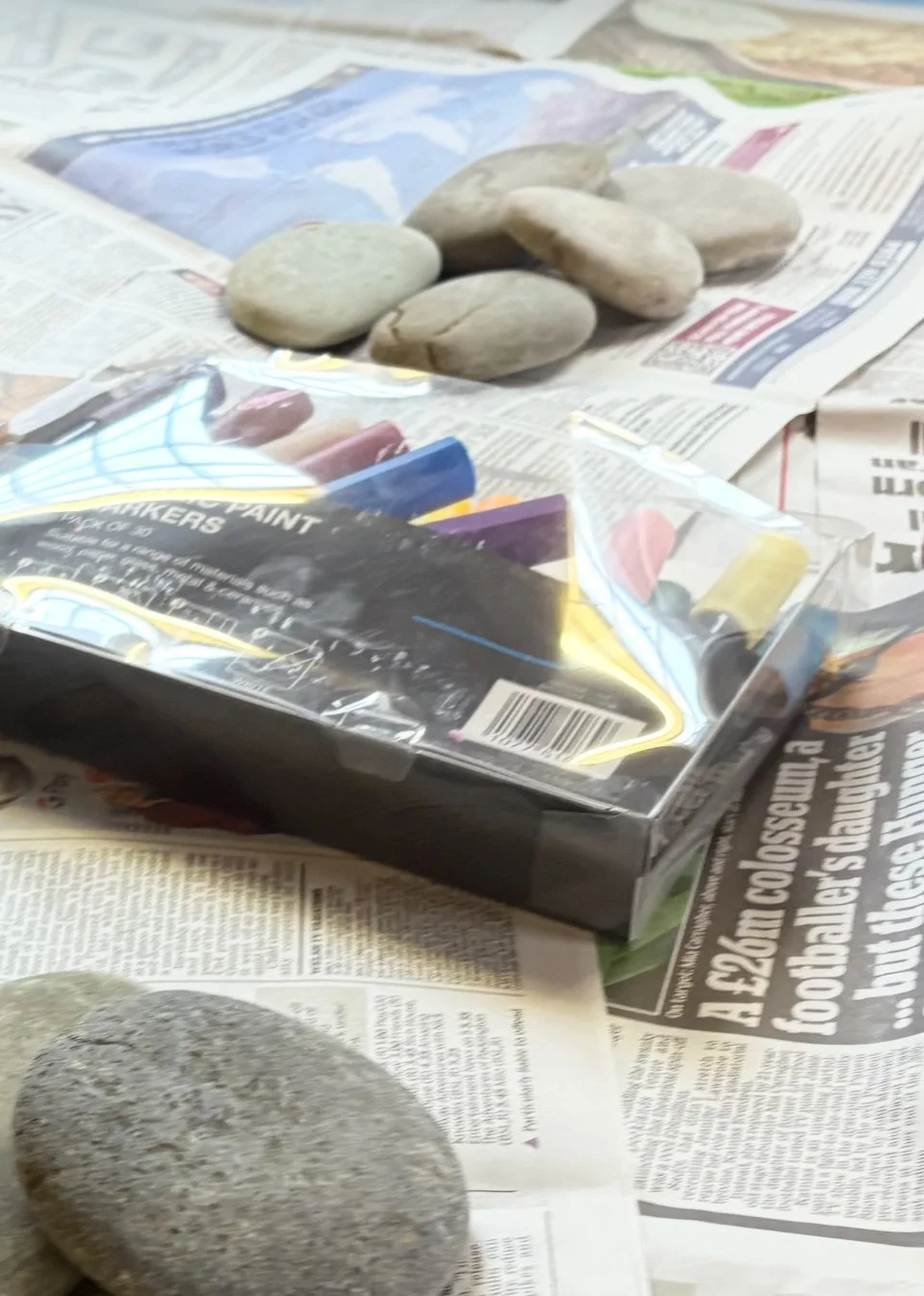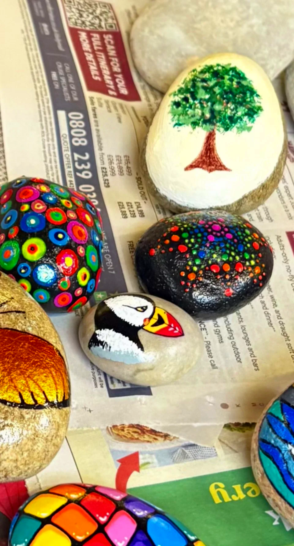 A local rock painter brought along examples of painted stones and shared simple techniques. There was no pressure to be artistic — just time to paint, chat, and enjoy the process.
